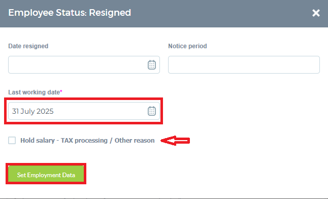 In the popup, select the last working date, and then click on the Set Employment Data button.